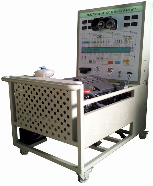 該設(shè)備采用翻新豐田卡羅拉1ZR電控汽油發(fā)動機總成及運行附件的固定臺架和運行檢測控制面板臺架兩部分組成。