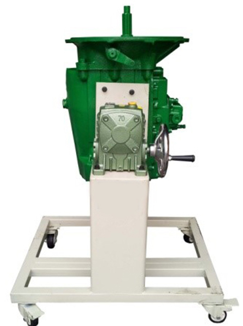 1.采用翻新天錦EQ1120GA2 8JS125TA型手動變速器總成(附件齊全,易于拆裝),并裝在專用翻轉(zhuǎn)架上。 采用減速翻轉(zhuǎn)機構(gòu),可使變速器旋轉(zhuǎn)任意角度,并能任意位置鎖止,便于學(xué)生從不同的角度進行拆卸和裝配。